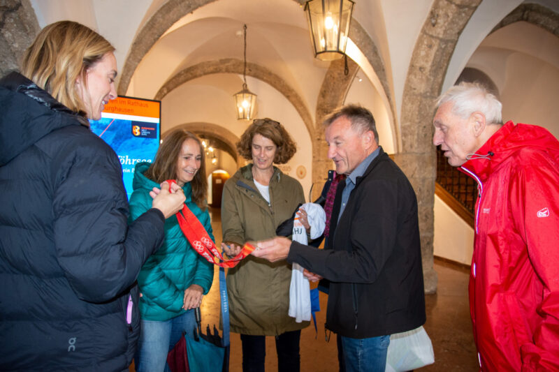 Zum Fototermin gekommen waren auch als Sponsor Tanja Erb (EBG – Energieversorgung Burghausen) mit Sprinterin Alexandra Burghardt sowie Dagmar Riesinger vom SV Wacker. Alexandra Burghardt hat zwei olympische Medaillen gewonnen. Kürzlich in Paris mit der Sprint-Staffel Bronze sowie 2022 als Bob-Anschieberin in Peking. Das ist in der Kombination mit Winter- und Sommerspielen erst sechs weiteren Menschen gelungen. Sie hatte die Medaillen dabei, die alle sehr aufgeregt angeschaut haben. Danke @Alexandra Burghardt fürs Dabeisein und natürlich, dass Du uns Deine Medaillen mitgebracht hast!