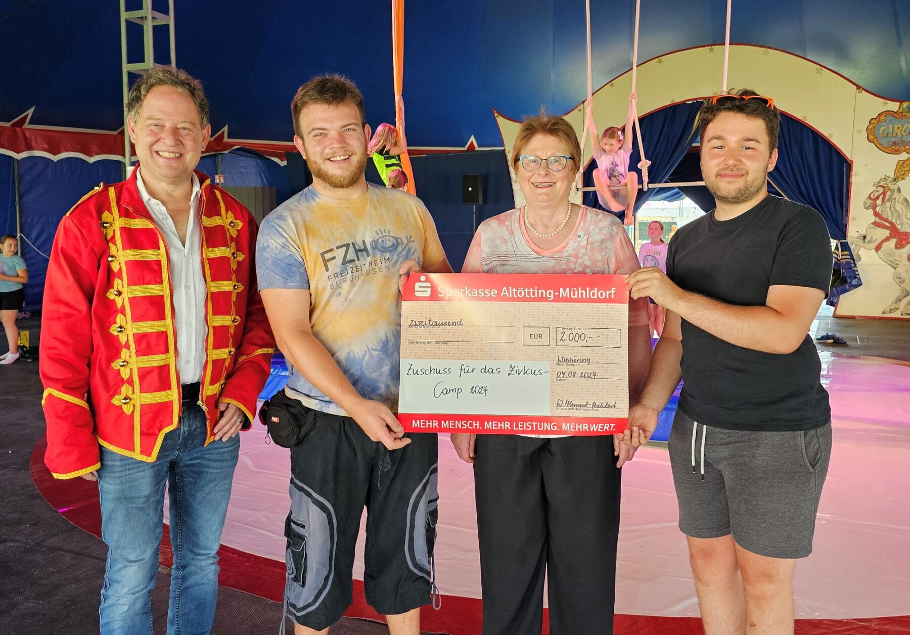 Marcel Anslinger, Leiter des Freizeitheims und Zeltmeister beim Zirkuscamp, sowie David Broz, Vorsitzender des Fördervereins für die Jugendarbeit in der Stadt Burghausen e. V., freuten sich sehr über die Spenden. Das Geld können sie zum Beispiel für die Verpflegung der Kinder während des Feriencamps nutzen oder neue Kostüme bzw. Akrobatik-Spielsachen kaufen.