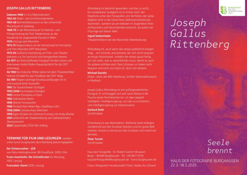 Ab Samstag, 22. März 2025 können sich die Besucher selbst ein Bild davon machen. Um 19 Uhr wird an diesem Abend die Ausstellung JOSEPH GALLUS RITTENBERG ∙ Seele brennt im Haus der Fotografie in Burghausen eröffnet.