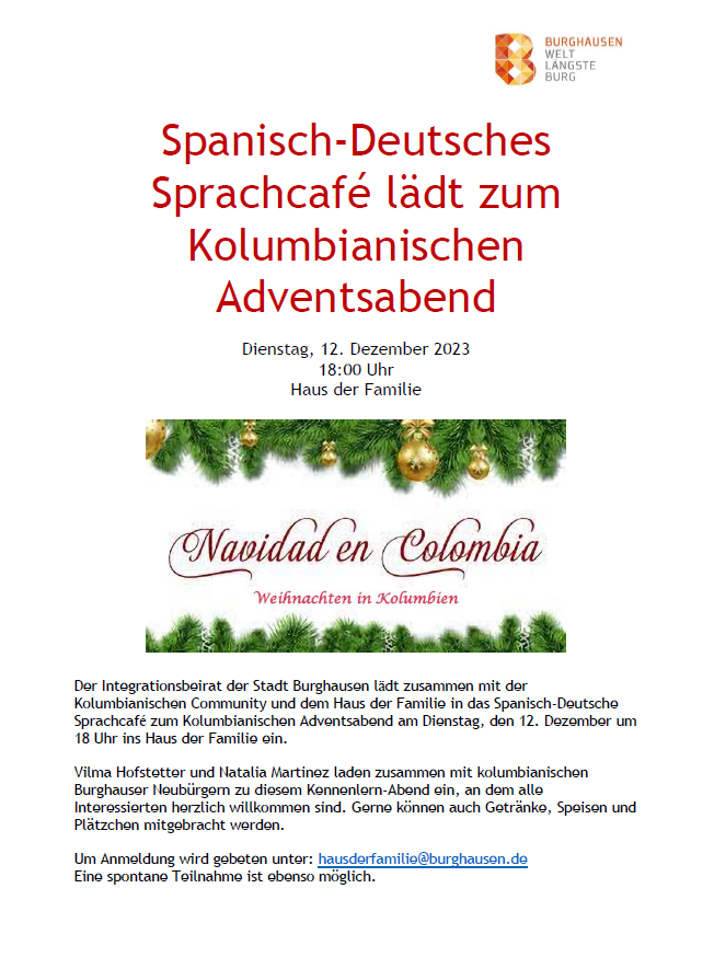 Der Integrationsbeirat der Stadt Burghausen lädt zusammen mit der Kolumbianischen Community und dem Haus der Familie in das Spanisch-Deutsche Sprachcafé zum Kolumbianischen Adventsabend am Dienstag, den 12. Dezember um 18 Uhr ins Haus der Familie ein.
