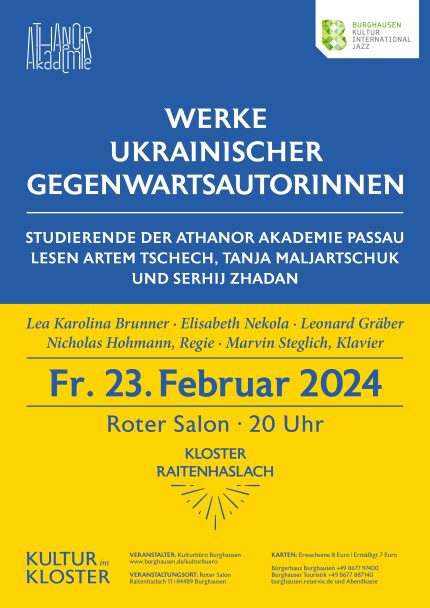 Am Freitag, den 23. Februar, 20 Uhr kommen im Roten Salons des ehem. Klosters Raitenhaslach/Burghausen ukrainische Gegenwartsautorinnen und –autoren zu Wort. „Der Krieg ringt mit der Sprache, das Schreiben widerspricht dem Tod“ schrieb der ukrainische Autor Serhij Zhadan 2022 in seinem Buch „Himmel über Charkiw“. Für sein literarisches Werk hat der Autor, Journalist und Musiker 2022 den Friedenspreis des deutschen Buchhandels bekommen. Zhadan und auch seine Schriftstellerkollegen Tanja Maljartschuk und Artem Tschech ( beide gehören ebenfalls zu den wichtigen literarischen Stimmen in der Ukraine) thematisieren in ihren Werken ihre Erschütterung gegenüber dem allgegenwärtigen, andauernden Krieg, der schon seit 2015 die Sicht auf die Welt für immer verändert hat. Drei Studierende der Athanor Akadamie für Darstellende Kunst und Film Passau, Lea Karolina Brunner, Elisabeth Nekola und Leonhard Gräber, haben sich mit den ukrainischen Autoren auseinandergesetzt und werden versuchen, die Welt, die dort beschrieben wird, in einer Lesung ( in deutscher Sprache) greifbar zu machen. Leider haben die Texte nichts an Aktualität verloren.