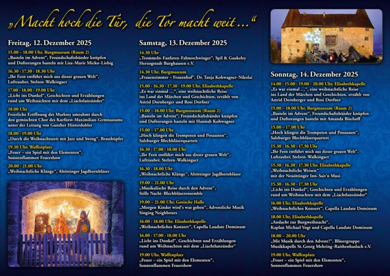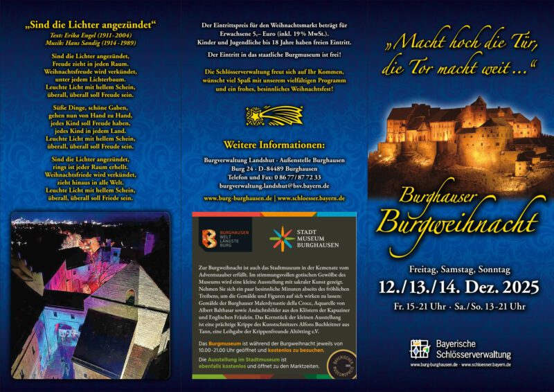 Unter dem Motto „Macht hoch die Tür, die Tor macht weit …“ lädt die Bayerische Schlösserverwaltung von Freitag, den 12. Dezember (15-21 Uhr), bis Sonntag, den 14. Dezember (13-21 Uhr) zur beliebten Burgweihnacht ein.