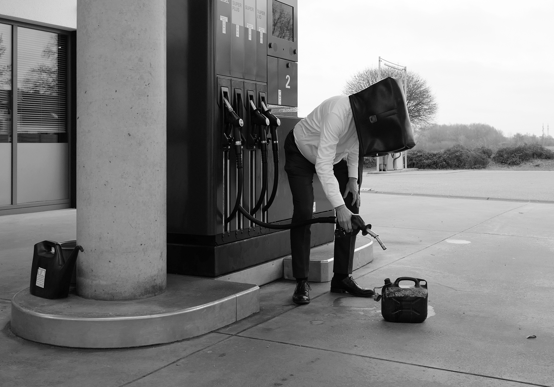 Erklären konnte Christian Springer die Bedeutung der Aktentasche mit dem Rat der Bundesregierung in den frühen 1960er Jahren während des Kalten Krieges, im Fall von einer explodierenden Atombombe diese Tasche als Schutz über dem Kopf zu verwenden. Diese absurde und beschönigende Beruhigung der Bevölkerung ist für Springer verbunden mit der derzeitigen Situation einer Androhung von Atomschlägen durch Putin und Lawrow, den russischen Präsidenten und Außenminister. Sich mit diesen realen Situationen in unterschiedlicher Weise zu beschäftigen und eben nicht den Kopf in den Sand oder die Aktentasche zu stecken, ist eines der Hauptmotive der Schwarzweißfotografien, die derzeit im Bürgerhaus in der Ausstellung zu besichtigen sind.