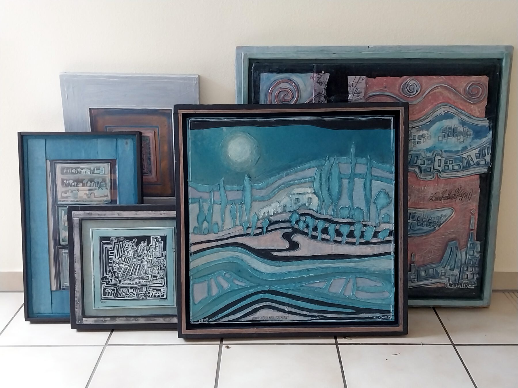 Die Leinwand, das Papier, die Grundierung bilden in ihren vielfältigen Anwendungen das Zusammenspiel von Farbe, Form und Linie. Auch Fundstücke verschiedener Materialien werden in diesem Prozess miteinbezogen und bilden dann mit den verschiedenen Mal- und Drucktechniken eine sich weiter entwickelnde Vorstellung und Thematik. Es entsteht langsam ein innerlich synästhetisches Werden.