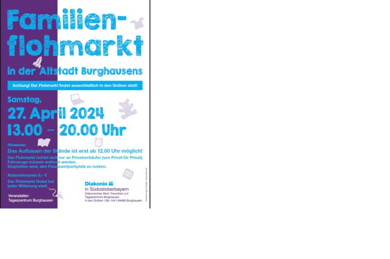 Familienflohmarkt Burghausen Das Aufbauen der Stände ist erst ab 12:00 Uhr möglich! Der Flohmarkt richtet sich nur an Privatverkäufer (von Privat für Privat). Fahrzeuge müssen entfernt werden. Empfohlen wird, den Finanzamtparkplatz zu nutzen. Nutzmeterpreis: 5,-€ Der Flohmarkt findet bei jeder Witterung statt. + Zu Google Kalender hinzufügen + iCal / Outlook exportieren Datum Samstag 27. Apr. .2024 Abgelaufen! Uhrzeit 12:00 - 20:00 Ortszeit Zeitzone: America/New_York Datum: Samstag 27. Apr. .2024 Zeit: 6:00 - 14:00 Standort Altstadt Kategorien Kinder/Jugendliche/ Familie Veranstalter Tageszentrum Burghausen Telefon +49 8677 911501 E-Mail dirk.hentrich@diakonie-traunstein.de Webseite http://www.diakonie-traunstein.de/tageszentrum-burghausen-neuoettig/