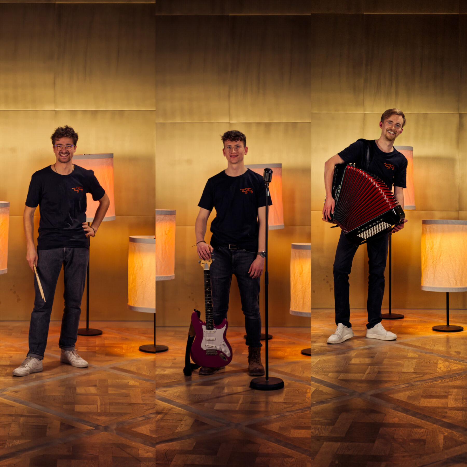 Das Funky Reflection Trio: Danny Shelton an E-Gitarre und Vocals, Marinus Weidinger an Akkordeon und Keys und Julian Steffl an den Drums.