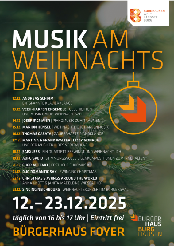 Genießen Sie in der Zeit vom 12. bis 23. Dezember besinnliche Musik von regionalen Musikern im Bürgerhausfoyer am großen, liebevoll geschmückten Weihnachtsbaum.