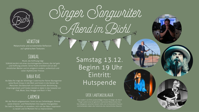 Sei ganz herzlich eingeladen und erlebe einen eimaligen Konzertabend mit 5 außergewöhnlichen Singer/Songwriter im Bichl.