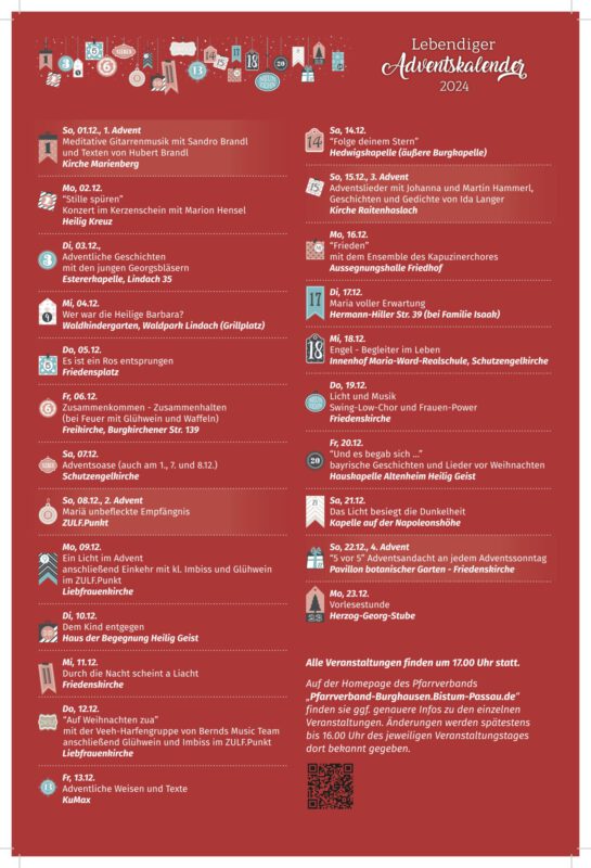 Impulse zum Advent bietet der Lebendige Adventskalender des Katholischen Pfarrverbands, der Evangelischen Gemeinde und der Evangelischen Freikirche Burghausen täglich vom 01. Dezember bis zum 23. Dezember 2024. Menschen treffen sich und kommen miteinander ins Gespräch – dazu bereiten verschiedene kirchliche Gruppen ganz unterschiedliche kurze Impulse und Gebete an teils ungewöhnlichen Orten vor. Lassen Sie sich überraschen und den Advent lebendig werden.