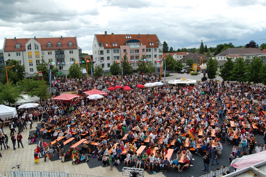 Eine große Tribüne, ein riesiger Biergarten und jubelnde Fans. So sieht es vom 14. Juni bis 14. Juli 2024 am Grünen Platz vor dem Bürgerhaus aus. Denn zur Fußball-Europameisterschaft (EM) wird es dort, wie zuletzt bei der Weltmeisterschaft 2006 in Deutschland, ein Public Viewing geben. Sitzplätze für etwa 2.250 Zuschauerinnen und Zuschauer gibt es dann auf dem Bürgerplatz dafür, ca. 250 auf der Sitztribüne, 2.000 im Biergarten.