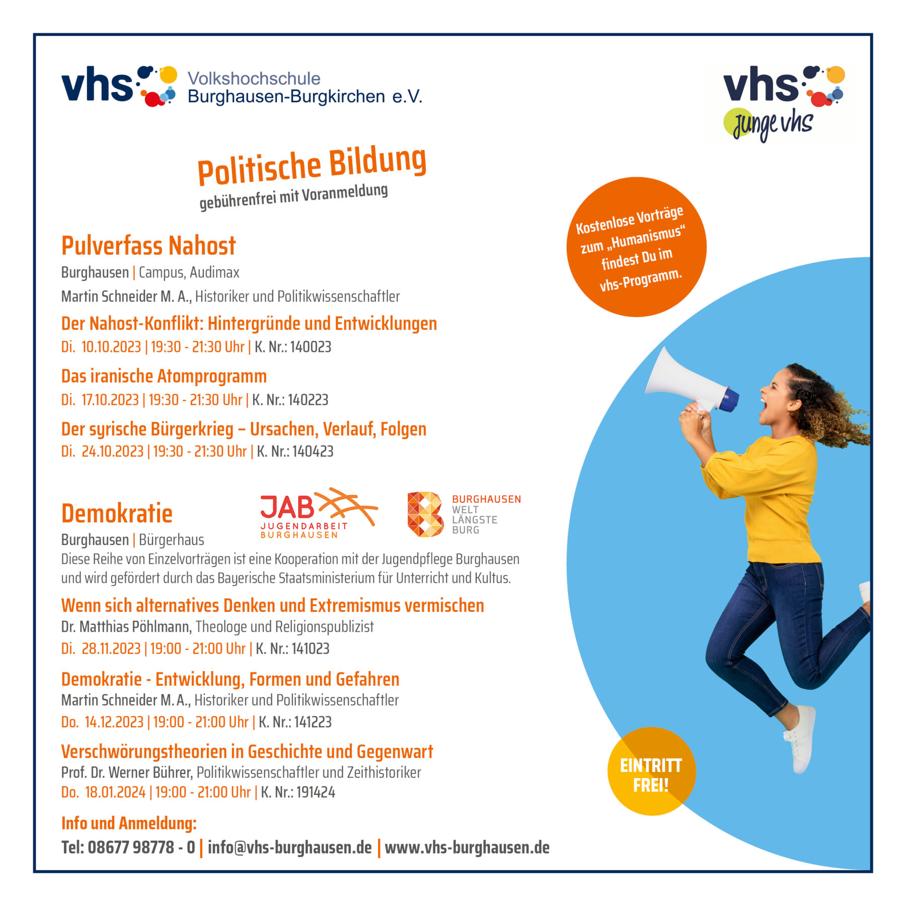 Wenn sich alternatives Denken und Extremismus vermischen Vortrag von Dr. Matthias Phölmann, Theologie und Religionspublizist. + Zu Google Kalender hinzufügen + iCal / Outlook exportieren Datum Dienstag 28. Nov. .2023 Abgelaufen! Uhrzeit 19:00 - 21:00 Ortszeit Zeitzone: America/New_York Datum: Dienstag 28. Nov. .2023 Zeit: 13:00 - 15:00 Status/Info Eintritt frei Standort Bürgerhaus Marktler Straße 15 a, 84489 Burghausen Kategorien VortragWissenschaft/Bildung Veranstalter vhs Burghausen Telefon +49 8677 98778-0 E-Mail info@vhs-burghausen.de Webseite http://www.vhs-burghausen.de