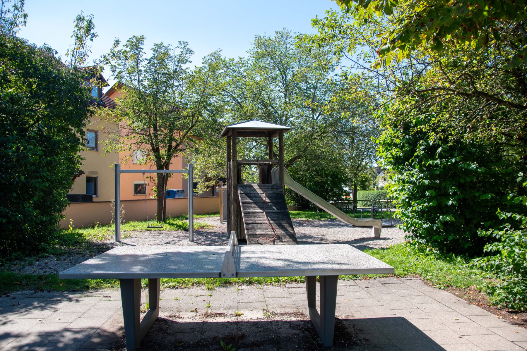 Hinter einigen Bäumen versteckt liegt der Spielplatz am Doktor-Wolfgang-Gruber-Weg. Er bietet seinen großen und kleinen Gästen viel Abwechslung und Spaß. Wer sich vom Toben, Rutschen und Schaukeln ausruhen möchte, setzt sich auf eine der beiden Bänke an den Holztisch und trinkt ein Schluck oder genießt seine mitgebrachte Brotzeit.