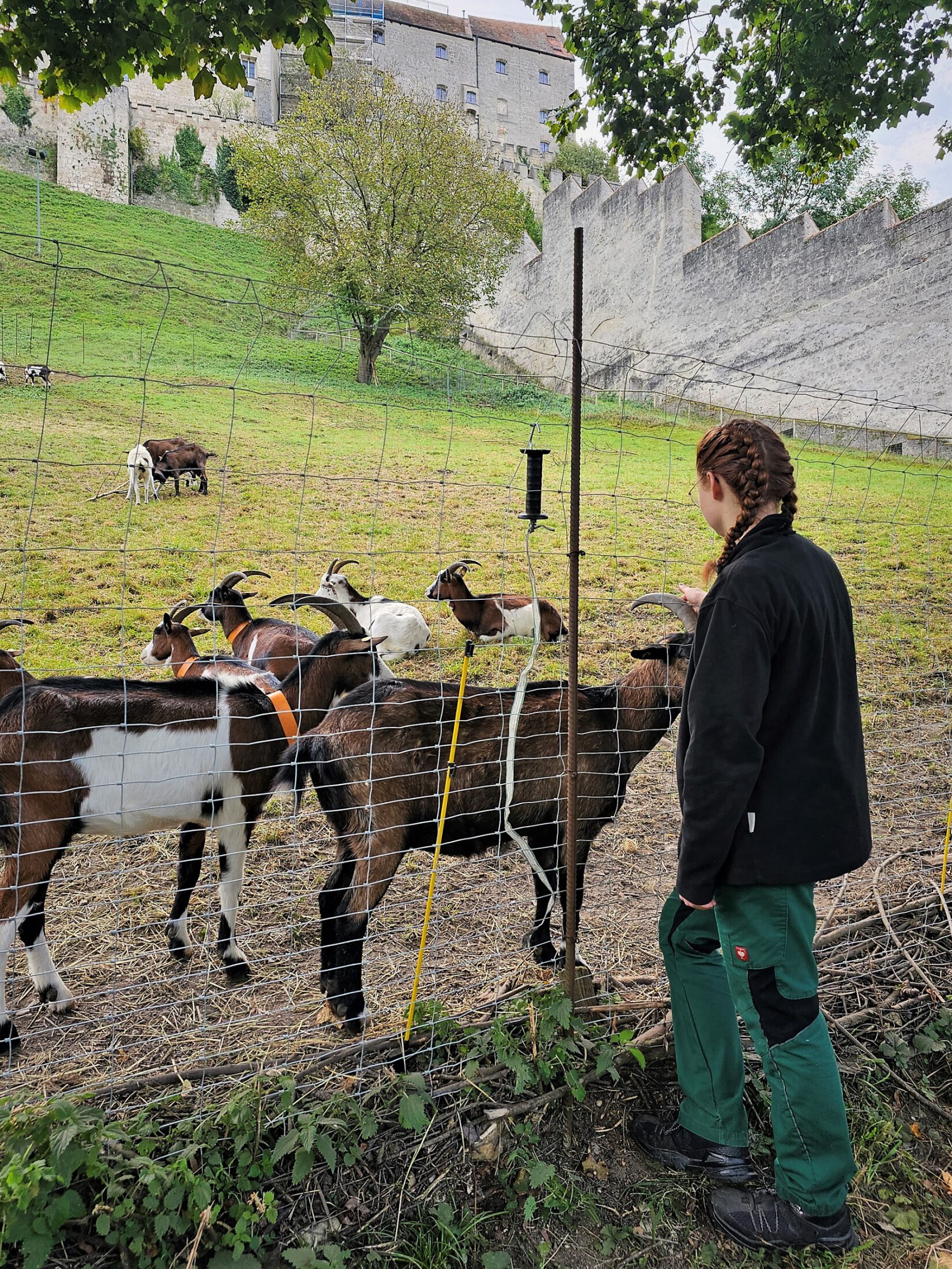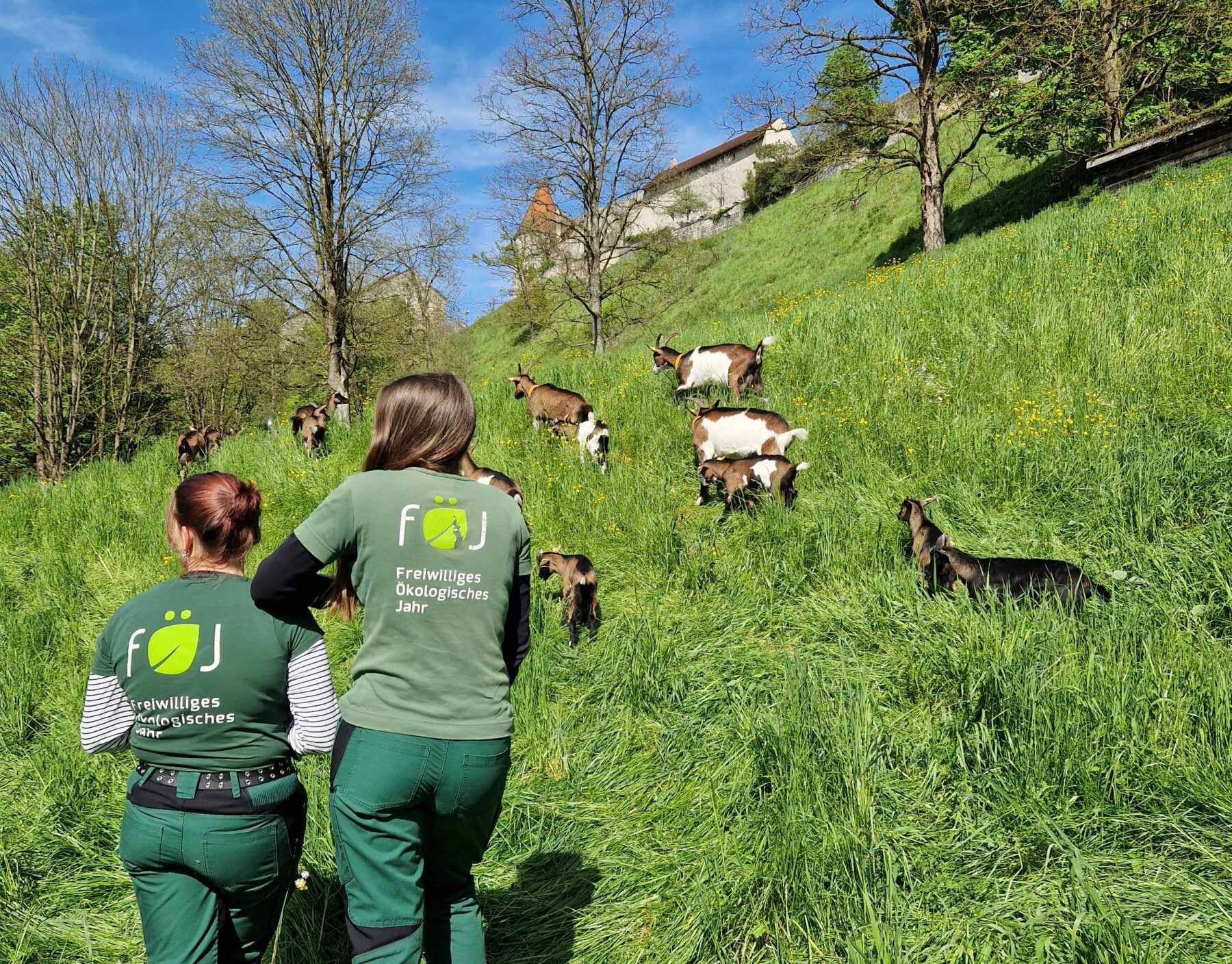 Die Hauptaufgabe der FÖJlerinnen und FÖJler ist die Betreuung der Tauernschecken. Diese Gebirgsziegenrasse weidet den Sommer über an den Hängen der Burghauser Burg.